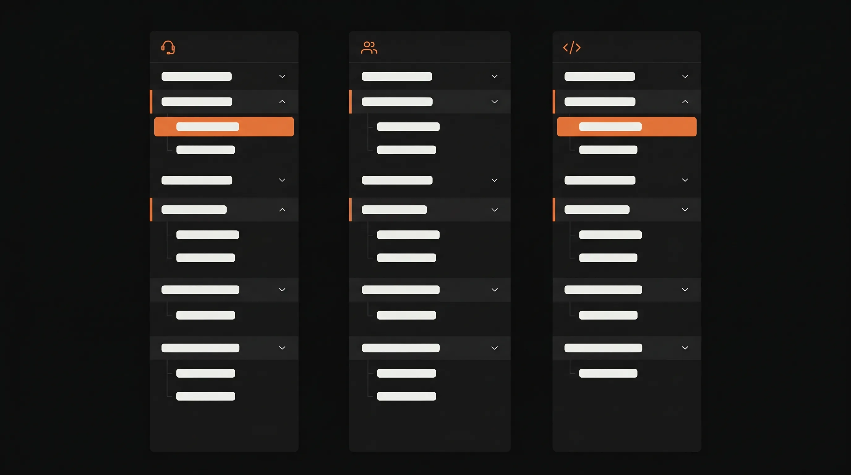 The sidebar mirrors your taxonomy exactly: 5-7 collapsible top-level entries, each with subcategories beneath. Order matters — put Get Started first, Troubleshooting last. The middle three (How-To, Concepts, Reference) sort by usage data once you have it.